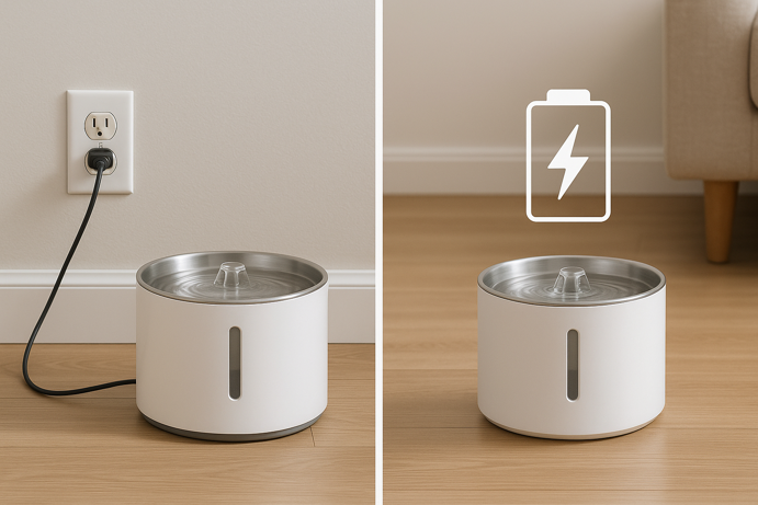 Battery operated models allow placement flexibility, cleaner aesthetics without cords and safer operation around pets who chew. They require regular recharging, cost more upfront and may have less powerful pumps. Advertised battery life (20-90 days) assumes intermittent use. Continuous operation can reduce this to just days instead of weeks.